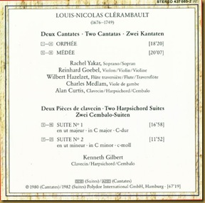 Here are two fine examples of an unduly neglected genre. The French cantata flowered at the beginning of the eighteenth century; by the middle of the century it was almost dead. The repertory is considerable; pre-eminent among its composers are Clérambault and Montéclair, along with Rameau (who wrote only a handful of cantatas); Bernier, Morin, Campra, Jacquet de Guerre, Mouret and others produced examples. The French cantata bears to the Italian much the same relationship as French opera to Italian opera: the divisions between recitative and air are less clearcut, the instrumentation more varied, the weight given to the verbal texts more considerable. Clérambault's Orphée and Médée both belong to his first book of cantatas, published in 1710. They were among the most celebrated and oft-performed cantatas of their time, and deservedly so. Médée is the more dramatic and Italianate, and has as its climax a remarkable "Evocation", a sombre F minor movement with a sullen, jerky obbligato for the violin in its lowest register. Also unorthodox is the movement where the bass continuo instrument is silent and the bass line is in the violin part; this happens even more strikingly in Orphée, with the timbre of soprano, violin, flute and harpsichord in its upper register making a very pure and charming effect.